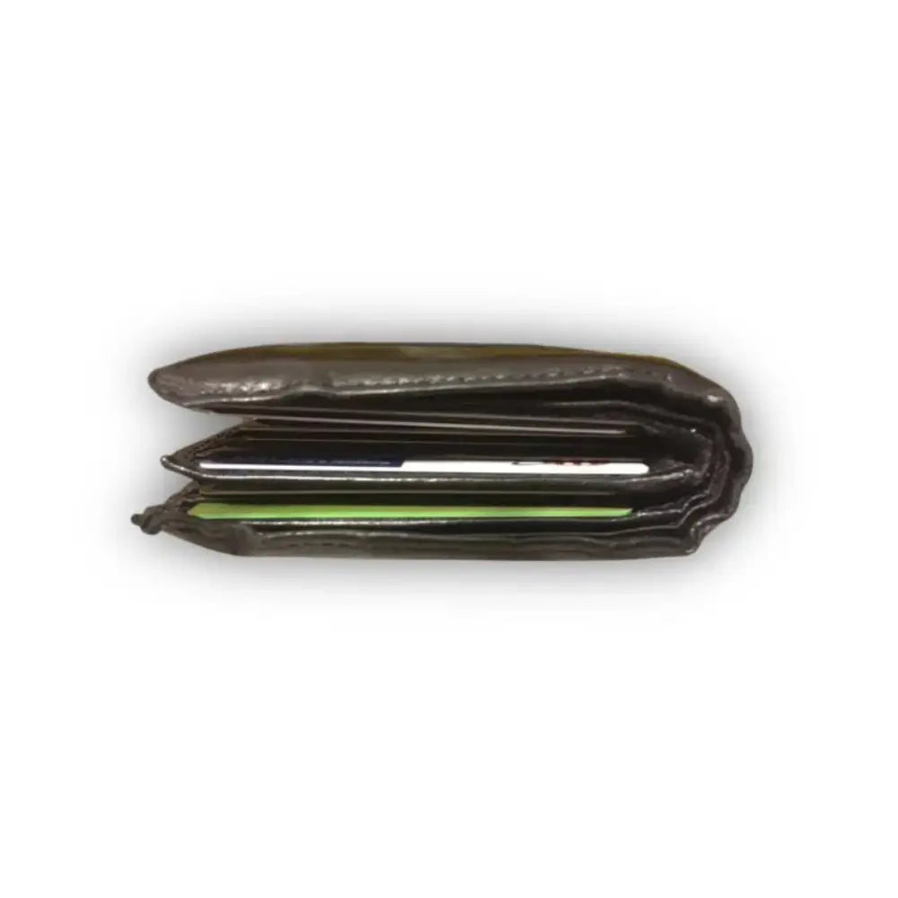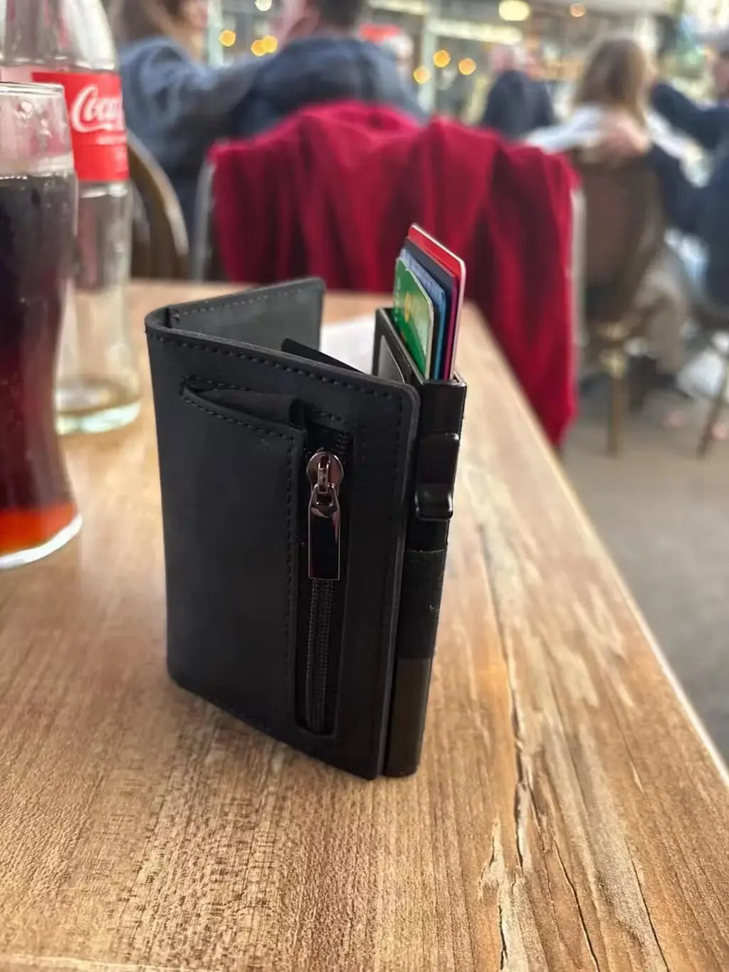 I love how slim this wallet is. The rear zip pocket is perfect for a few coins and folded cash. Cards slide out smoothly and the wallet still feels ultra-compact in hand.