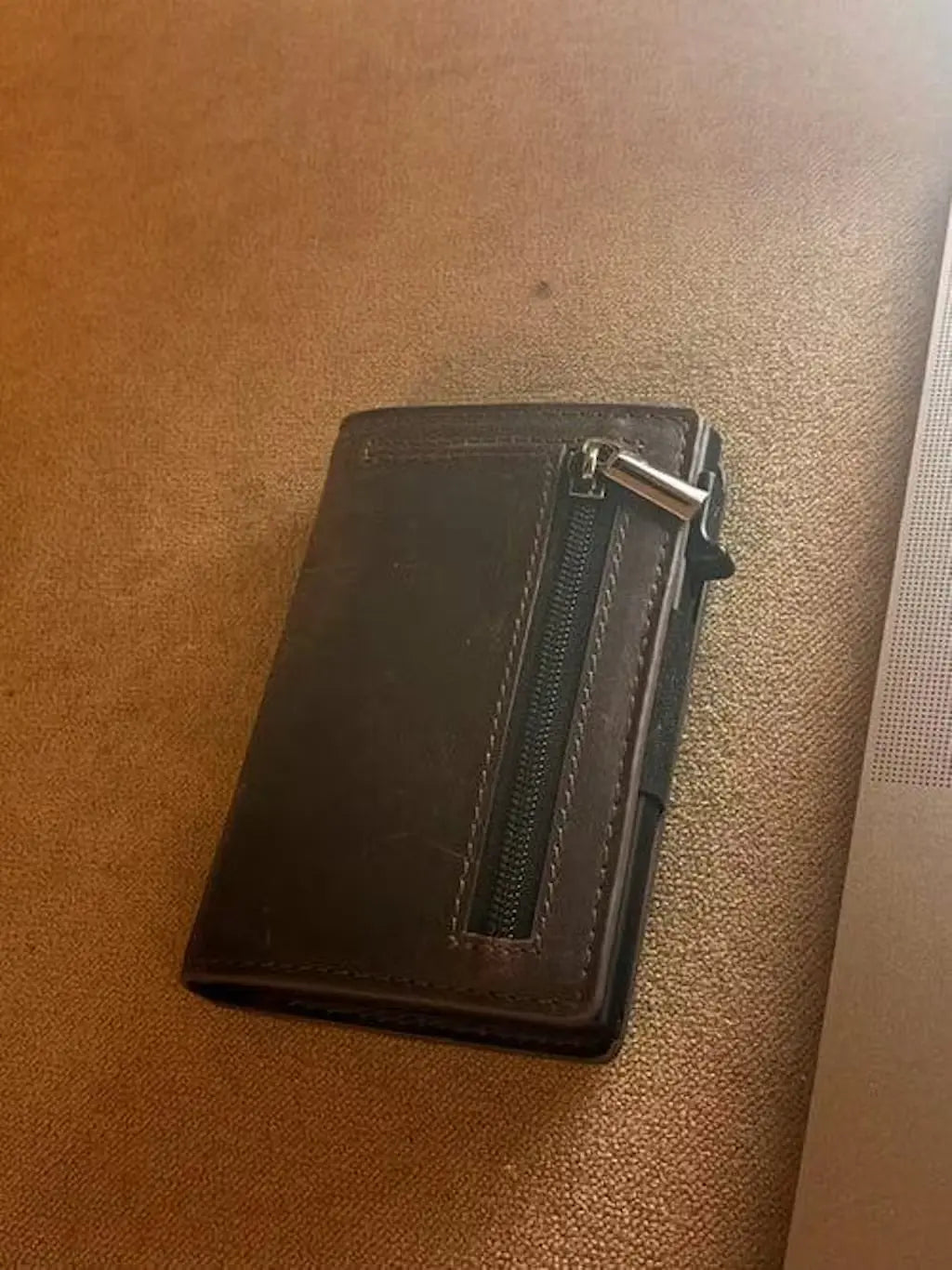 The brown leather looks great and feels durable. I can reach all my cards instantly, and the zip pocket is perfect for change or my AirTag. Very satisfied.